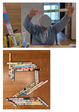 ハサミを使うことで手指の運動になり、ストローを通す作業も片手で簡単に取り組めるよう工夫しています。葉っぱをたくさん作り、秋の風景写真を見ながら作業していると、「あそこのイチョウは絶景だよ」「私は紅葉が好きかな」など、自然と秋の話題が広がりました。皆さまそれぞれに秋の景色を思い出しながら、季節感を楽しんでいらっしゃいました。