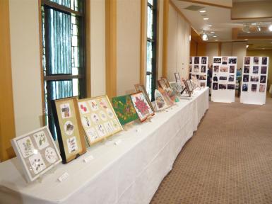 ホテルの会場のステンドグラスの前に、ゲストがこつこつと日々描いた水彩画や刺繍作品などがずらりと並びました。