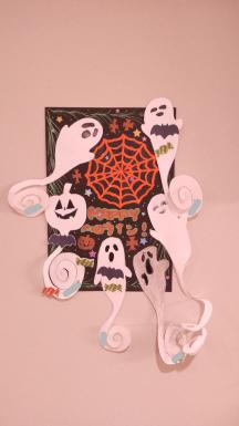 最後は、完成したオバケたちを大きなポスターにまとめて貼り、にぎやかなハロウィン飾りが出来上がりました。