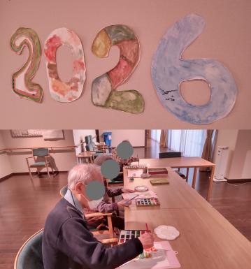 2026年を迎え、水彩絵の具を使って新年の飾り絵をゲストの皆さんと一緒に制作しました。お一人ずつ「2026」の数字を一つ担当し、それぞれが集中して丁寧に描き進めていました。