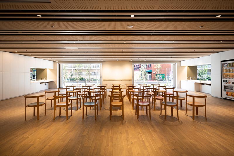 日帰りのデイサービスやリハビリテーションを行う広いスペースです。大人数が集まるレクリエーションやイベントも行われます。